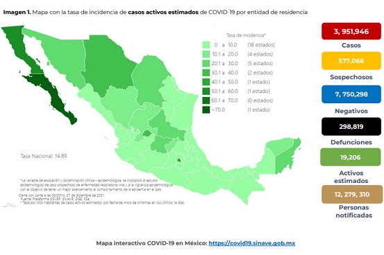 Indica que la curva epidémica registró en el periodo del 12 al 18 de diciembre un descenso de 7 por ciento en comparación con la semana previa.