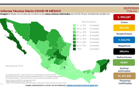 La curva epidémica de Covid-19 registró un incremento del 62 por ciento en el número de personas contagiadas por coronavirus en la semana 50 que corresponde al periodo del 19 al 25 de diciembre con la semana previa.