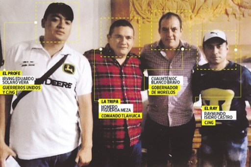 A su lado aparece el gobernador Blanco y al final, el líder regional del CJNG en Morelos, Raymundo Isidro Castro Santiago, alias “El Ray”, asesinado el 30 de octubre de 2019 dentro del Centro de Reinserción Social (Cereso) de Morelos, ubicado en Xochitepec, por una presunta riña entre grupos criminales encarcelados.