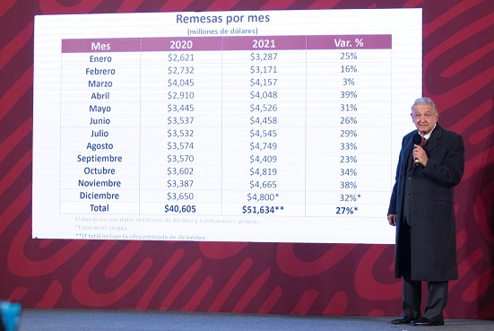 Las remesas que entraron al país durante 2021 permitieron que México saliera del hoyo que generó la crisis económica derivada de la emergencia sanitaria de Covid-19, afirmó este miércoles el presidente Andrés Manuel López Obrador.
