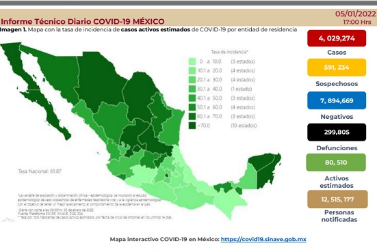 La pandemia activa se ubica en 80 mil 510 personas, la Ciudad de México con 20 mil 889 casos, Baja California Sur con 5 mil 553, el Estado de México con 4 mil 898, Quintana Roo con 3 mil 640, Nuevo León con 3 mil 445 y Baja California con 3 mil 234, son las entidades con mayor número de casos activos que han reportado síntomas en los últimos 14 días.