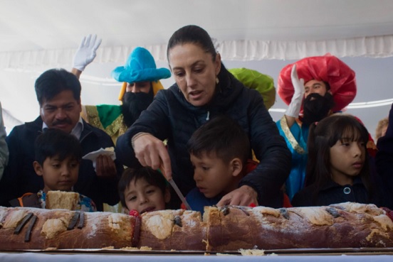 Los niños dejaron atrás la timidez en cuanto los funcionarios del gobierno capitalino sacaron la Rosca de Reyes y la primera en recibir una rebanada fue Lluvia.