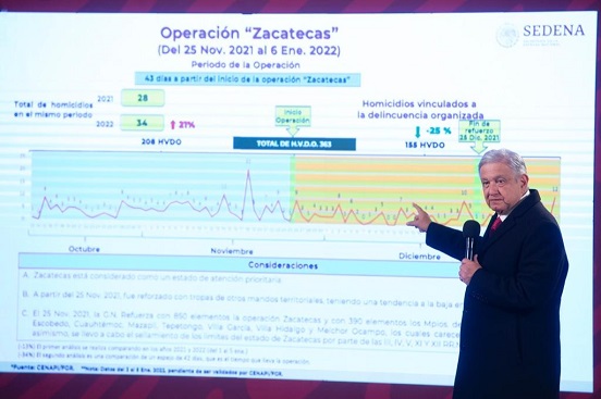 De acuerdo con datos de la Secretaría de la Defensa Nacional, del 25 de noviembre de 2021 al 6 de enero de 2022, en Zacatecas se registraron 155 homicidios vinculados a la delincuencia organizada, un 25 por ciento menos que en los 43 días previos (13 de octubre al 24 de noviembre).