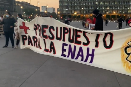 Estudiantes de la Escuela Nacional de Antropología e Historia (ENAH) se manifestaron la mañana de este miércoles frente a Palacio Nacional, con el objetivo de exigir mayor presupuesto y dignificación laboral para los trabajadores de la institución.