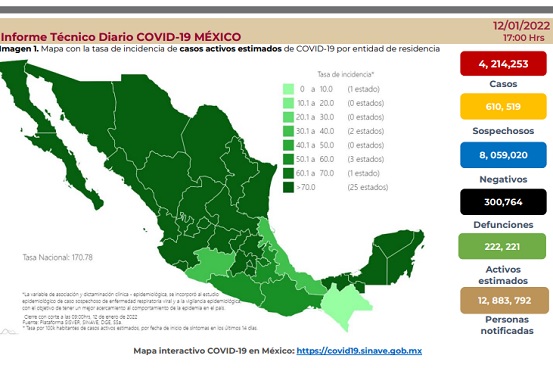 De acuerdo con la Secretaría de Salud, el total de contagiados es de 4 millones 214 mil 253, mientras que 300 mil 764 personas han fallecido como consecuencia del Covid-19 y de ellas, 190 fueron reportadas en las últimas 24 horas.