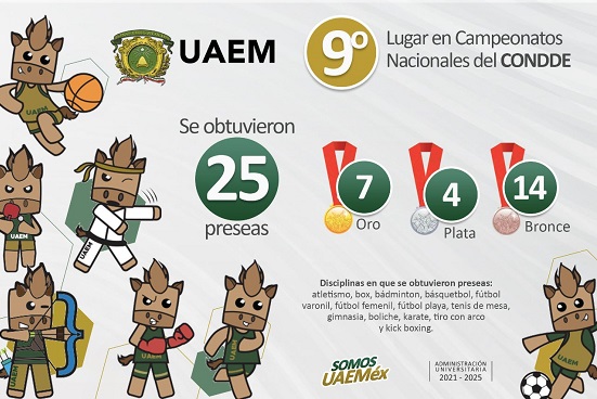 Destacada actuación tuvo la delegación de la Universidad Autónoma del Estado de México (UAEM) que participó en los campeonatos nacionales del Consejo Nacional del Deporte de la Educación (CONDDE), al ocupar el noveno lugar de la clasificación general y contabilizar 25 preseas: 7 de oro, 4 de plata y 14 de bronce.
