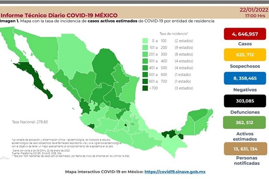 La primera semana epidemiológica de 2022 –del 2 al 8 de enero- cierra con incremento de 164 por ciento en el número de casos estimados en comparación con la anterior.