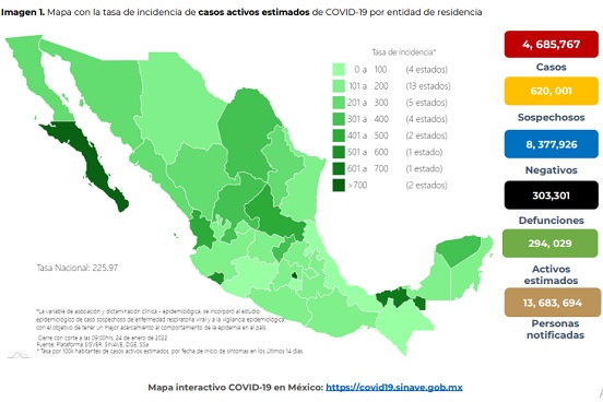 Con ello, el país acumula un total de 4 millones 685 mil 767 casos positivos confirmados y 303 mil 301 muertes por complicaciones derivadas de la enfermedad desde el inicio de la pandemia.