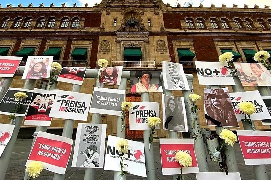 La manifestación se registró de manera pacífica y en silencio colocaron un memorial con fotografías de periodistas asesinados sobre las vallas metálicas frente al balcón central de este recinto. Igualmente colocaron flores y se lee en las pancartas justicia para los compañeros asesinados.