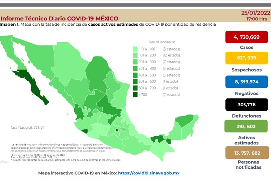 Los contagios activos, es decir, con capacidad de transmisión se mantiene elevado, pues suman 293 mil 602, es decir, el 5.9 por ciento del total de contagios detectados a la fecha. La Secretaría de Salud (Ssa) reportó que las personas que han superado la enfermedad son 3 millones 808 mil 28.
