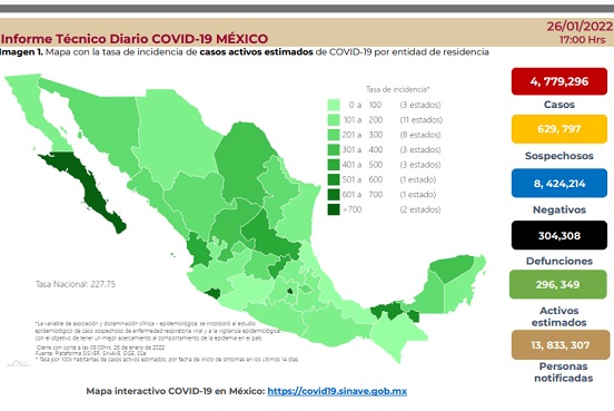 Pese a ello, el descenso en la velocidad de los contagios se mantiene. La curva epidémica mantiene el incremento de 17 por ciento para el periodo del 9 al 15 de enero en comparación con la primera semana epidemiológica del año. Los casos activos estimados, es decir, con síntomas en los últimos 14 días suman 296 mil 349.