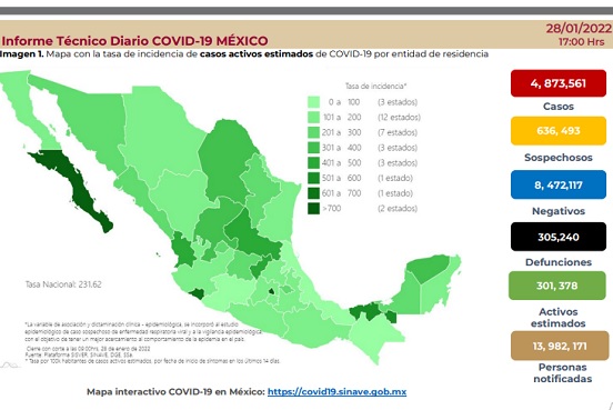 En el caso de las defunciones se registraron 437 muertes que acumulan un total de 305 mil 240 desde marzo del 2020.