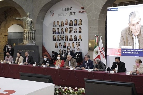 Al inaugurar los trabajos de la reunión Plenaria de los senadores de Morena, el encargado de la política interior del país, felicitó al coordinador de la bancada, Ricardo Monreal.