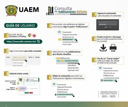 Para el semestre 2022A, los más de 23 mil jóvenes que realizan estudios en los 10 planteles de la Escuela Preparatoria de la Universidad Autónoma del Estado de México (UAEMéx) podrán adquirir en formato digital, los libros de texto en el espacio virtual Consulta de Publicaciones Digitales Universitarias (ALDU), disponibles en la dirección: https://www.aldu.uaemex.mx