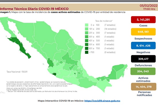 Sin embargo, al cierre de la tercera semana epidemiológica del año (16 al 22 de enero), se reporta una reducción de menos 24 por ciento en los contagios estimados, en comparación con el periodo del 9 al 15 de enero, mienrras que los casos activos estimados, es decir, con capacidad de contagio se reportan en 204 mil 43, es decir, el 3.8 por ciento de todos los casos detectados a la fecha.
