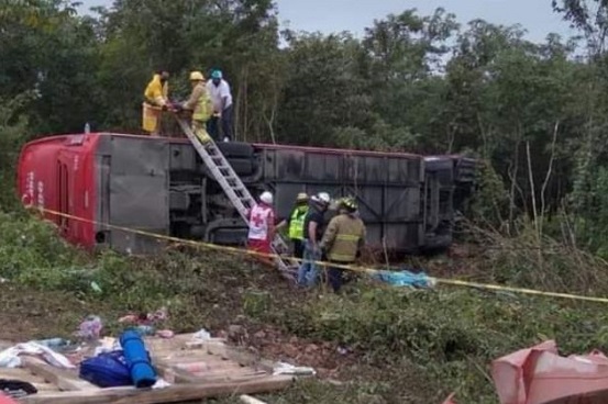 La volcadura de un autobús de pasajeros suma ya 15 heridos y ocho muertos a la altura de El Tintal, autopista Mérida-Cancún.