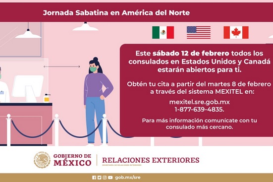 El próximo sábado 12 de febrero, los 55 consulados de México en América del Norte, así como las secciones consulares de las embajadas de México en Washington D.C. y en Ottawa abrirán sus puertas para atender a las personas que requieran tramitar pasaportes, matrículas consulares y credenciales para votar.