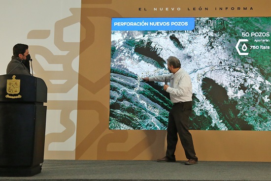 Tras encabezar la rueda de prensa de El Nuevo León Informa, acompañado de Juan Ignacio Barragán, Director de los Servicios de Agua y Drenaje de Monterrey, el Mandatario dio a conocer acciones como la perforación de 22 pozos en la Macroplaza, la rehabilitación de 30 pozos existentes, la perforación de 50 nuevos pozos y otros 6 de los considerados profundos, para con estas 108 fuentes contar con 2 mil 674 litros más por segundo de suministro de agua para el Área Metropolitana de Monterrey.