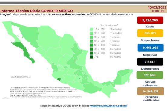 La Secretaría de Salud (SSa) reportó este jueves 34 mil 261 nuevos casos de Covid-19, con un acumulado de 5 millones 226 mil 269, mientras que los decesos se elevaron a 927 decesos, para un total de 311 mil 554, desde el inicio de la pandemia.