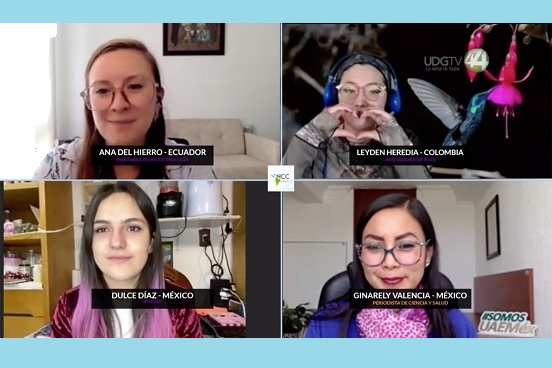 En el marco del Día Internacional de la Mujer y la Niña en la Ciencia, las científicas Ana del Hierro, de Ecuador; Leyden Heredia, de Colombia, y Dulce Díaz, de México, convocadas por el Noticiero Científico y Cultural Iberoamericano, participaron en el foro que fue moderado por la directora general de Comunicación Universitaria de la Universidad Autónoma del Estado de México (UAEMéx), Ginarely Valencia Alcántara.