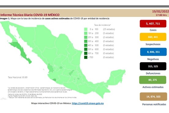 Además informaron que al corte de información se tienen registrados 74 mil 230 casos activos con una tasa de incidencia de 57 por 100 mil habitantes. Los primeros lugares en casos son: Colima, Baja California Sur, Ciudad de México, Tlaxcala, Nayarit, Aguascalientes, Querétaro, Campeche, Puebla e Hidalgo.