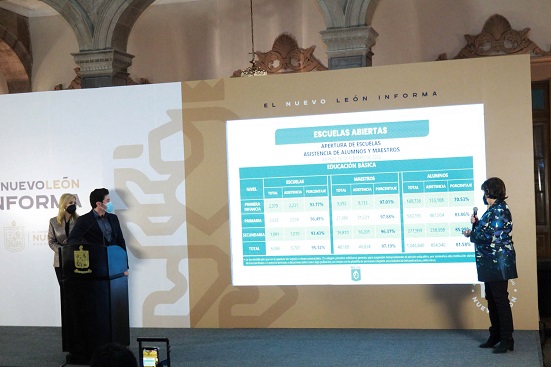 En la rueda de prensa el Nuevo León Informa, la Secretaria de Educación estatal, Sofialeticia Morales Garza, destacó que 5 mil 791 (95.12 por ciento) de los planteles ya están abiertos.