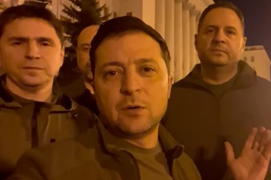 «Estamos todos aquí, nuestros militares están aquí, los ciudadanos, la sociedad, estamos todos aquí, defendiendo nuestra independencia, nuestro Estado», proclamó Zelenski, vestido con un traje verde oliva de tipo militar y acompañado entre otros por su primer ministro, su jefe de gabinete y un asesor cercano.