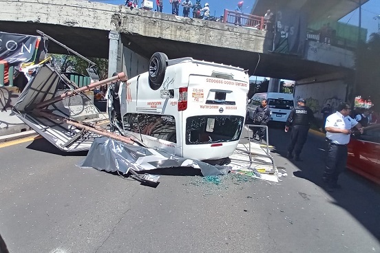 Una combi de la ruta 22 cayó desde un puente vehícular en carriles centrales de Periférico, en el municipio de Tlalnepantla, Estado de México.