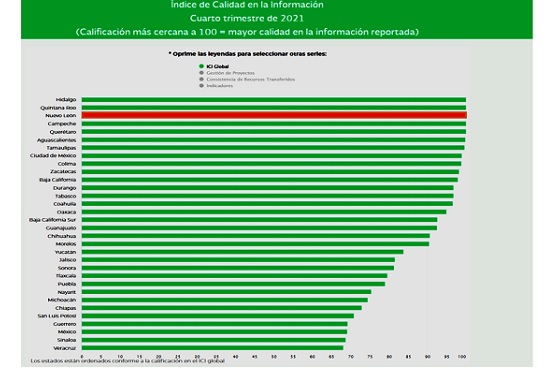 Nuevo León se colocó en segundo lugar nacional en la clasificación del Índice de Calidad en la Información (ICI) reportada sobre Recursos Federales Transferidos, en la evaluación correspondiente al cuarto trimestre de 2021. La calificación asignada a la entidad por la Secretaría de Hacienda y Crédito Público (SHCP) fue de 99.99 puntos de cien posibles. El promedio nacional fue de 88.12 puntos.