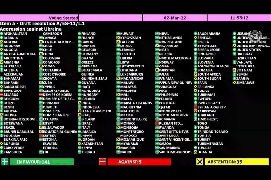 Mientras, 35 Estados optaron por la abstención (entre los que destacan China, Cuba, India y Sudáfrica) y 12 decidieron no participar en la votación (incluidos Venezuela, Marruecos y Etiopía).