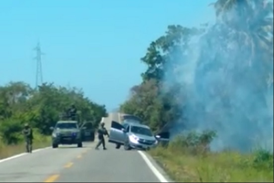 Al notar la presencia de militares, los tripulantes de una camioneta gris abrieron fuego y fueron repelidos a la altura de la comunidad de Nuxco. Dos de los cuerpos fueron localizados ensangrentados en la parte trasera de los asientos, mientras que otro más estaba tendido a las afueras, sobre la carretera y a un costado del vehículo.