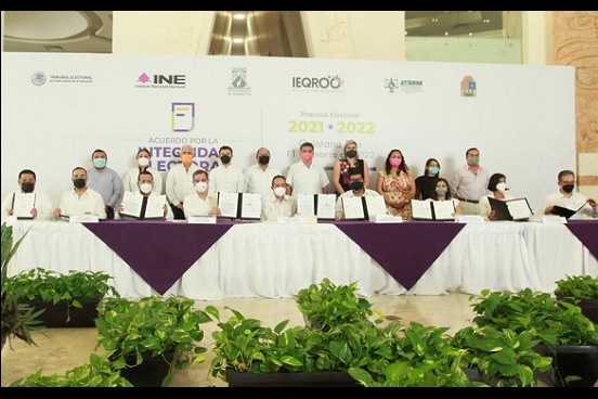 Asumir responsabilidades sociales y cívicas para la organización y el desarrollo de un proceso electoral íntegro en Quintana Roo es el compromiso que establecieron el Instituto Nacional Electoral (INE), el Tribunal Electoral del Poder Judicial de la Federación (TEPJF), el Tribunal Electoral de Quintana Roo (TEQROO), el Instituto Electoral de Quintana Roo (IEQROO) y partidos políticos locales al firmar el Acuerdo por la Integridad Electoral del Proceso Electoral 2021-2022.