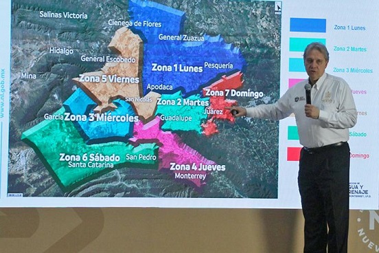El director de los Servicios de Agua y Drenaje de Monterrey, Juan Ignacio Barragán, explicó que cada una de las siete zonas de la metrópoli tendrá un día por semana una reducción de presión del suministro a partir de las 9 de la mañana.