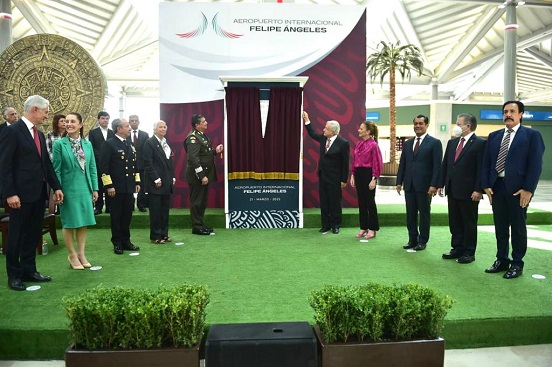 “La Secretaría de la Defensa Nacional hace entrega del Aeropuerto Internacional Felipe Ángeles, una magna instalación que contribuirá al desarrollo y crecimiento económico del país y que refleja en sus originales detalles la historia, el arte y la cultura de nuestra nación; proyecto que representa el esfuerzo, ingenio y profesionalismo de los ingenieros militares, quienes cumplieron con su elevada responsabilidad de manera eficaz, precisa y con plena convicción para beneficio y orgullo del pueblo de México. La conclusión de este importante complejo aeroportuario fue posible gracias a la ardua e incansable labor de los trabajadores de la construcción, técnicos, empresas y proveedores nacionales y extranjeros. 21 de marzo de 2022”.