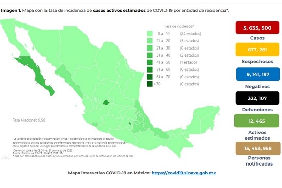 Al corte de información del día de hoy, se tienen registrados 11 mil 758 casos activos con una tasa de incidencia de 9 por 100 mil habitantes (del 8 al 21 de marzo del 2022).