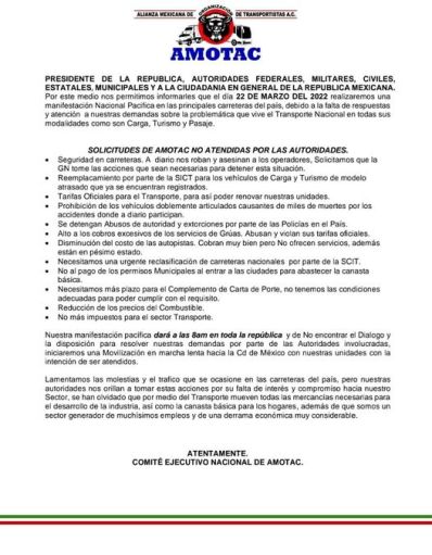 «Lamentamos las molestias y el tráfico que se ocasione en las carreteras del país, pero nuestras autoridades nos orillan a tomar estas acciones», indicó la AMOTAC en comunicado.