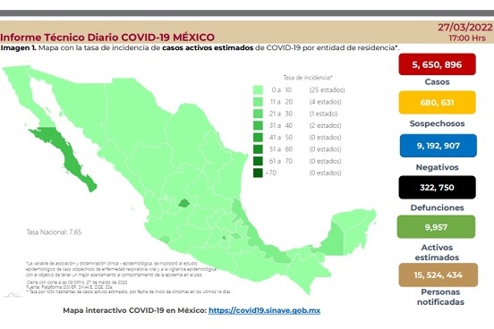 Este domingo la Secretaría de Salud reportó 919 nuevos contagios de Covid-19, con los que se acumula un total de 5 millones 650 mil 896 casos; en tanto, 322 mil 750 personas han fallecido como consecuencia de esta enfermedad y de ellas 15 fueron reportadas en las últimas 24 horas.