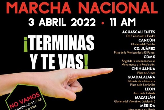 Alejandra Morán, presidenta nacional del Chalecos MX en conjunto con más de 100 organizaciones ciudadanas convocó a participar el próximo 3 de abril a las 11:00 horas, en la marcha nacional #NOVAMOS ¡Terminas y Te Vas! en contra de la Revocación de Mandato del presidente de la República, Andrés Manuel López Obrador, que partirá del Monumento a la Independencia hacia el Monumento a la Revolución.