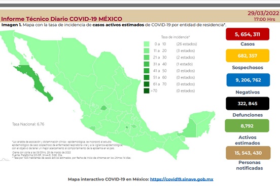 La Secretaría de Salud (Ssa) reportó este martes 2 mil 758 nuevos contagios de Covid-19, con los que se acumulan un total de 5 millones 654 mil 311 casos; en tanto, 322 mil 845 personas han fallecido como consecuencia de esta enfermedad, de ellos, 84 fueron reportados en las últimas 24 horas.