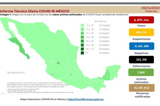 Este martes la Secretaría de Salud reportó 4 mil 223 nuevos casos de Covid-19 con los que se acumulan un total de 5 millones 671 mil 144 contagios; en tanto, 323 mil 318 personas han fallecido como consecuencia de esta enfermedad y de ellas, 83 fueron reportas en las últimas 24 horas.