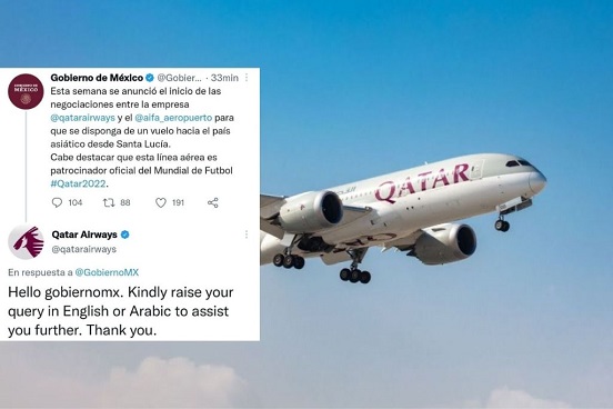 La cuenta de Twitter de Qatar Airways (@qatarairways) le solicita al Twitter del Gobierno de México (@GobiernoMX) que escriba en inglés o árabe.