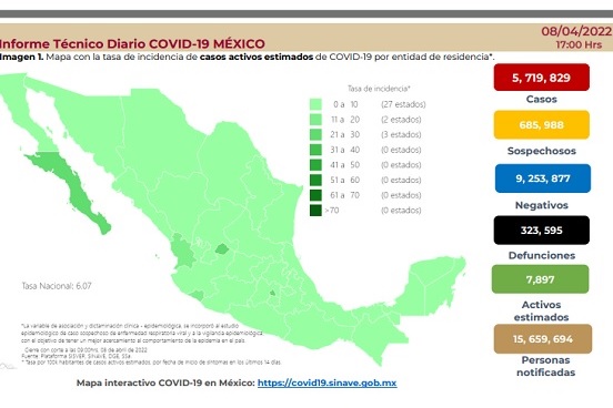 Aguascalientes, Baja California Sur, Ciudad de México, Colima, Nayarit, Quintana Roo, Baja California, Campeche, San Luis Potosí y Veracruz son los estados que presentan mayor número de casos activos los cuales son 7 mil 264.