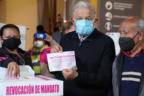 El presidente Andrés Manuel López Obrador acudió junto a su esposa Beatriz Gutiérrez Müller a la casilla ubicada en la calle de Moneda de la alcaldía Cuauhtémoc para emitir su voto en la proceso histórico de la revocación de mandato.