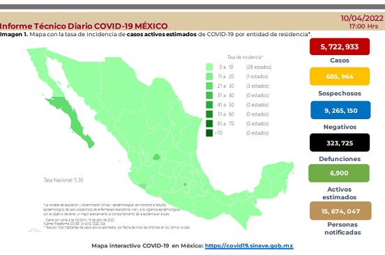 Este domingo se reportaron 392 nuevos contagios de Covid-19, con los que el país acumula un total de 5 millones 722 mil 933 casos; en tanto, 323 mil 725 personas han perdido la vida a consecuencia de esta enfermedad y de ellas, 5 fueron reportadas en las últimas 24 horas.