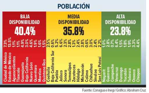 A Nuevo León se le añade Cuidad de México, Estado de México, Baja California, Aguascalientes, Tlaxcala, Guanajuato, Querétaro, Morelos y Quintana Roo, entidades cuya disponibilidad oscila entre 73 y mil 18 metros cúbicos anuales por persona, y se clasifican como entidades con baja disponibilidad de agua, según la Comisión Nacional del Agua.