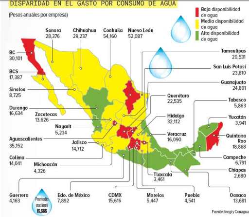 Mientras a nivel nacional el costo promedio anual por el uso del líquido para las empresas es de 15 mil 565 pesos, en Nuevo León este costo asciende a 52 mil 87 pesos; a 35 mil 152 pesos en Aguascalientes y a 24 mil 801 pesos en Guanajuato.