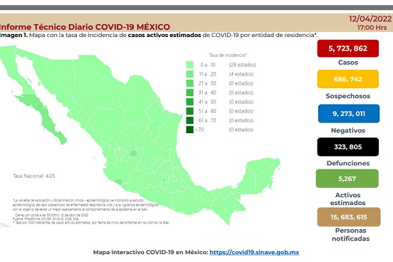 Este martes se reportaron 648 nuevos contagios de Covid-19, con los que México acumula un total de 5 millones 723 mil 862 casos; en tanto 323 mil 805 personas han fallecido por esta enfermedad y de ellas 78 fueron reportadas en las últimas 24 horas.