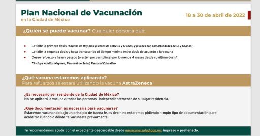 Sólo es necesario dijo, que acudan con su expediente de vacunación el cual pueden descargar en el sitio vacunacion.cdmx.gob.mx y en el caso de los refuerzos que haya pasado más de cuatro meses de la aplicación de la última vacuna.