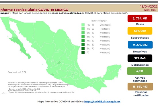 Al día de hoy hay 4 mil 490 casos activos, de acuerdo a la autoridad. El orden de estados que presentan casos activos son Baja California Sur, Ciudad de México, Aguascalientes, Colima, San Luis Potosí, Quintana Roo, Nayarit, Sinaloa, Baja California y Yucatán.