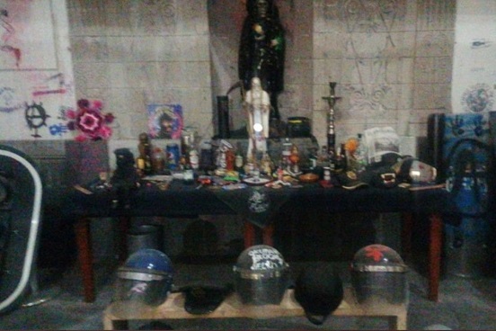 Cascos de policía, semáforos rotos, dulces y hasta el retrovisor de un auto es parte de un altar a la santa muerte que las encapuchadas tenían en el edificio.